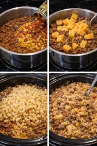 Seasoned ground beef cooks down until perfectly browned, then gets mixed with sweet corn, tomatoes, and taco spices. Cubes of cheese melt right into the mixture, creating a thick, creamy sauce that coats every bite. Finally, tender macaroni gets stirred in to soak up all that flavor.