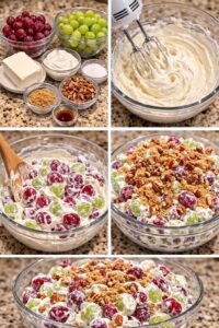 It’s cool, creamy, and perfectly balanced between sweet and fresh. Juicy red and green grapes are coated in a rich cream cheese and sour cream mixture that’s lightly sweetened with sugar and vanilla. The result is a fluffy, smooth dressing that wraps around every grape.