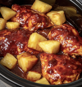 It’s the kind of meal you can start in the morning, let simmer quietly all day, and come home to a kitchen that smells warm, sweet, and welcoming. Tender chicken, sticky BBQ sauce, and that subtle tropical note — simple ingredients coming together in the most soothing way.