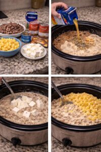 It’s hearty, creamy, and packed with savory flavor. Tender ground beef simmers slowly in a rich blend of soups, broth, and seasonings, creating a thick, flavorful sauce. As it cooks, the flavors deepen and come together into a smooth, comforting base.