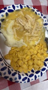Crockpot Chicken and Gravy served over homemade mashed potatoes and Velveeta Mac and Cheese: