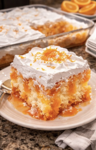 It’s soft, ultra-moist, and packed with bright citrus flavor, balanced perfectly with a light, creamy topping. The magic of this cake comes from the poke method — after baking, the cake is filled with a sweet orange Jello and soda mixture that soaks into every bite, making it incredibly flavorful and refreshing.