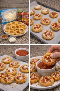 Sprinkle a little shredded mozzarella cheese into the center of each onion ring. Try not to overfill them too much — just enough to create that cheesy pizza center without spilling all over the pan.
